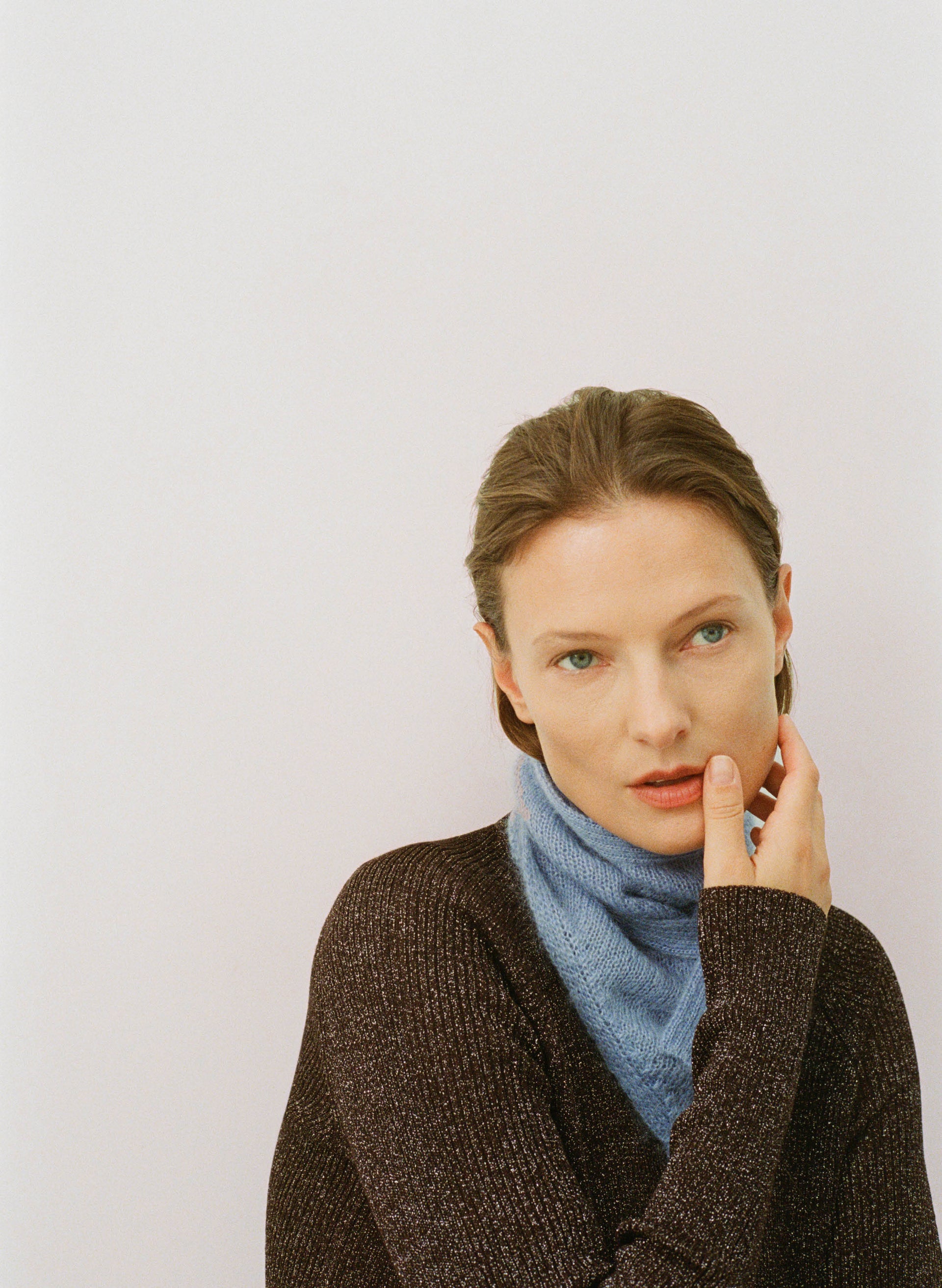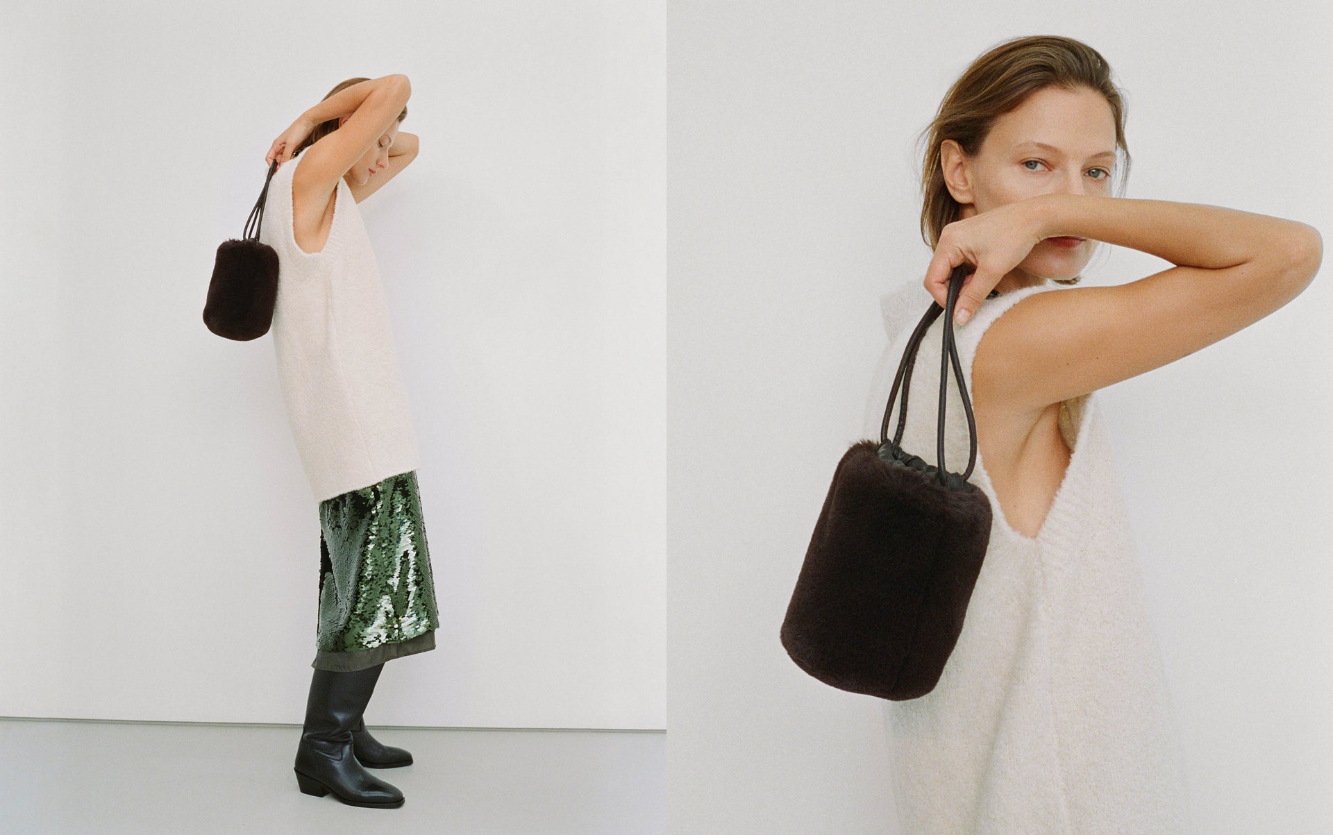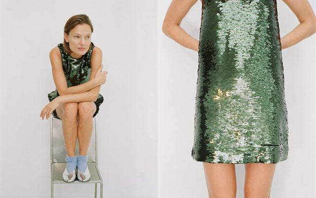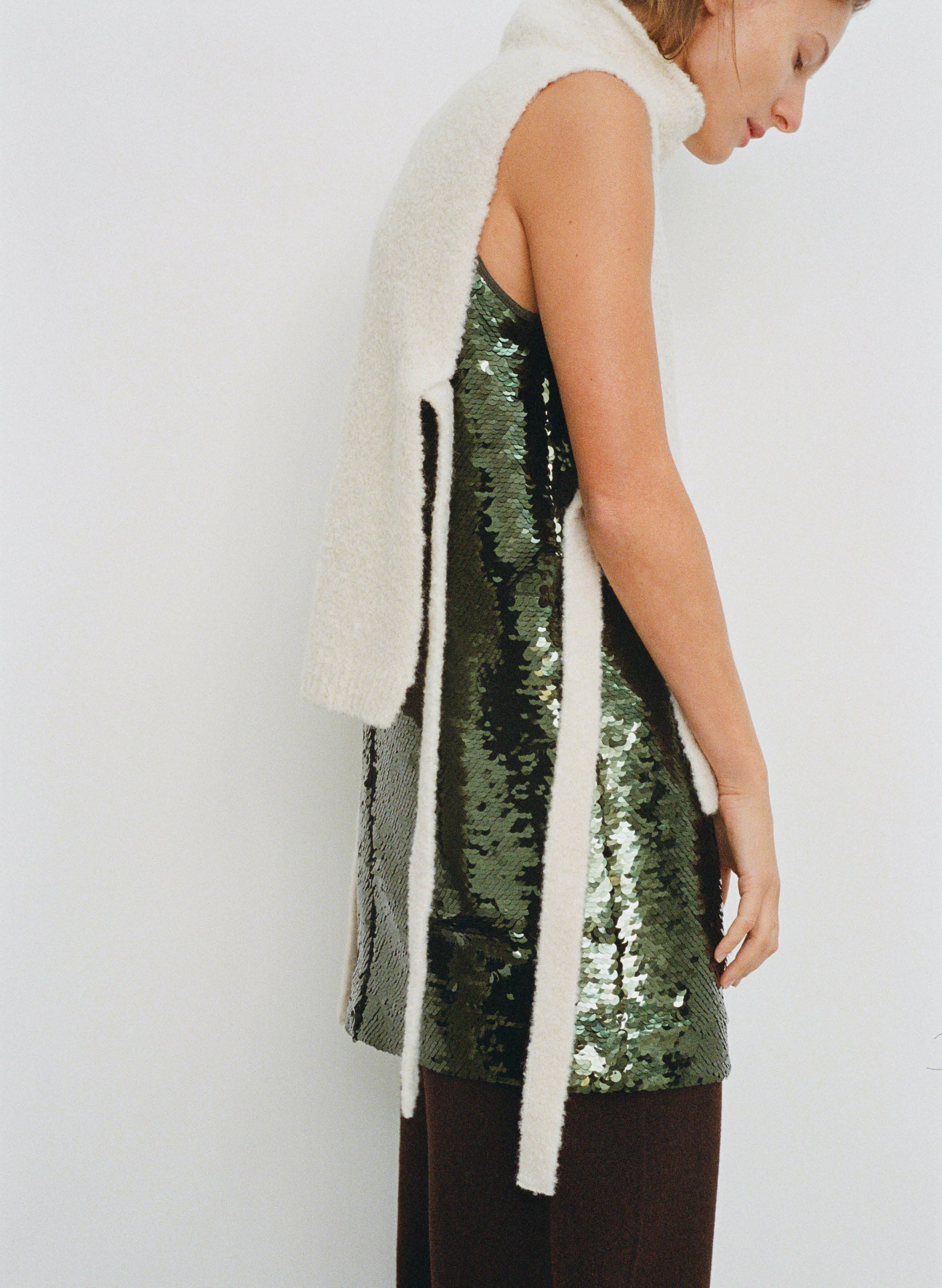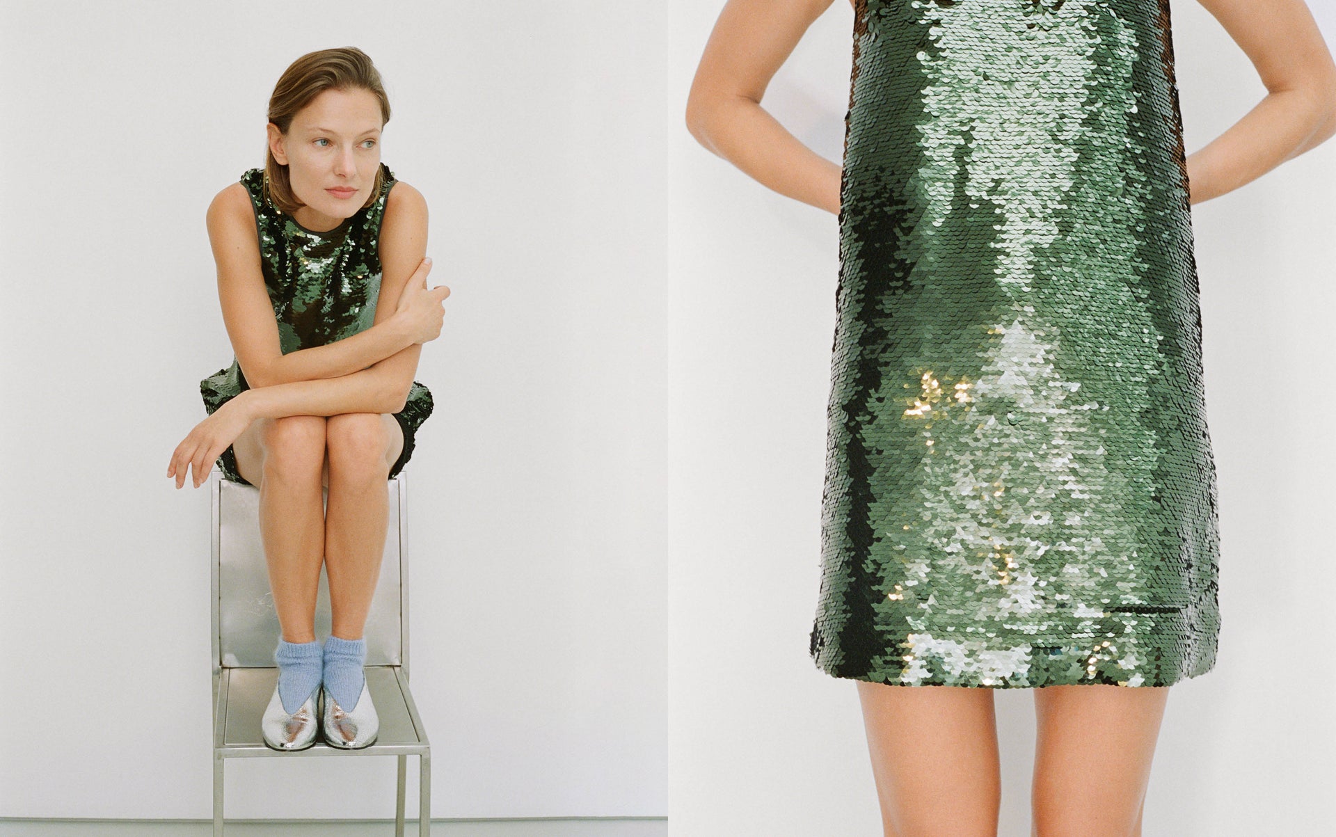 A timelessly elegant double-face brown sweater, an ecru wool and alpaca minidress or a midnight green sequinned skirt.