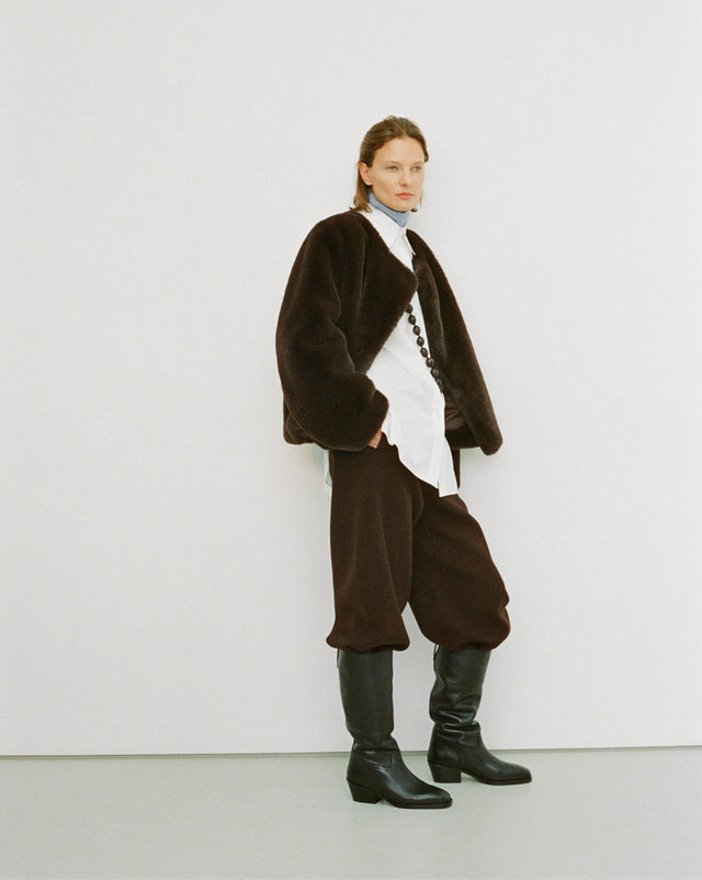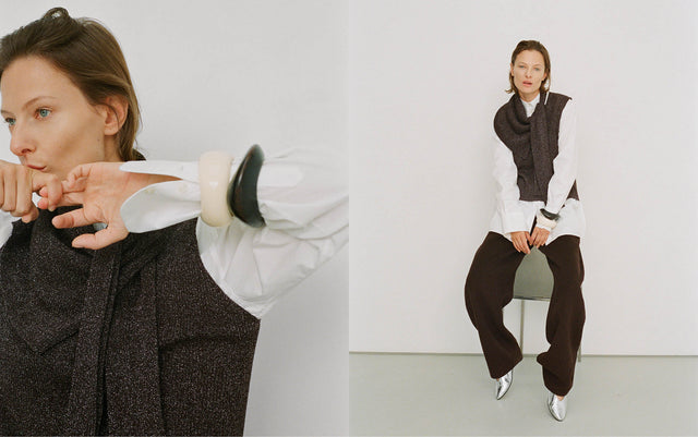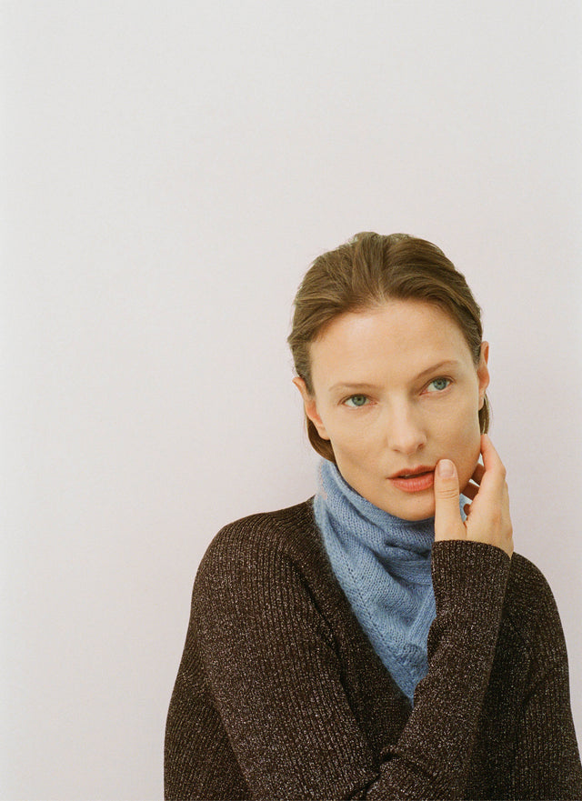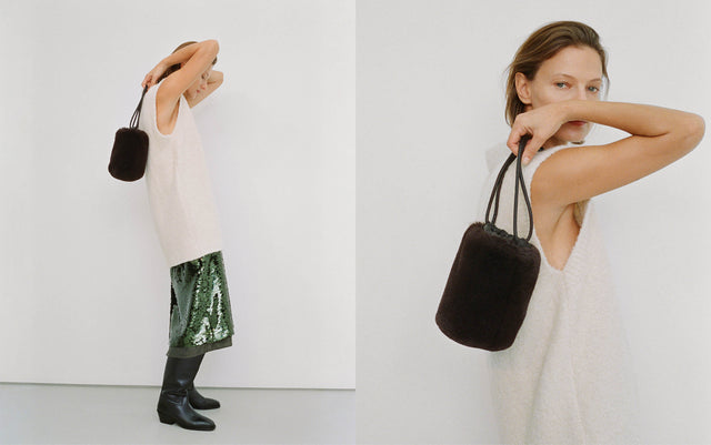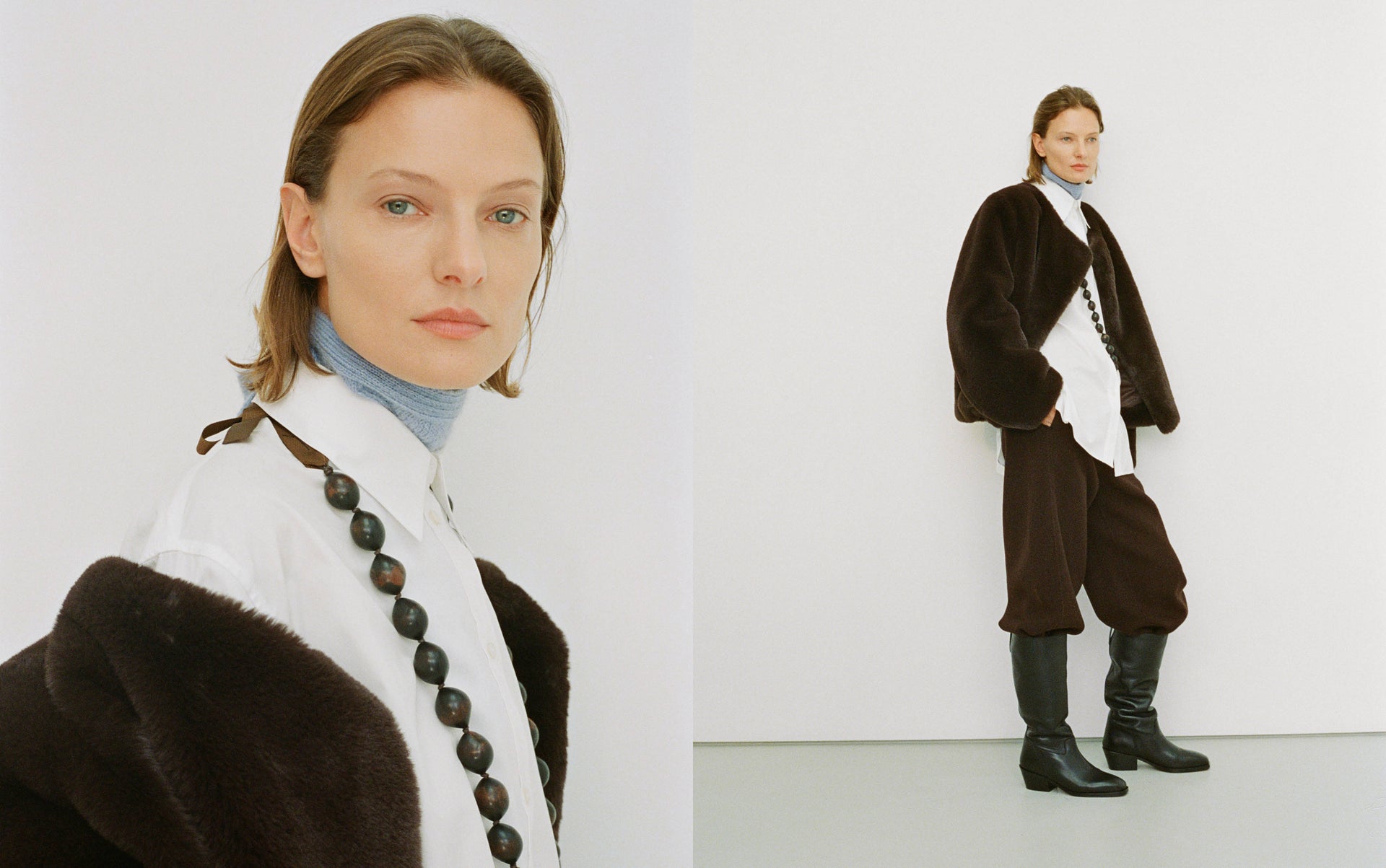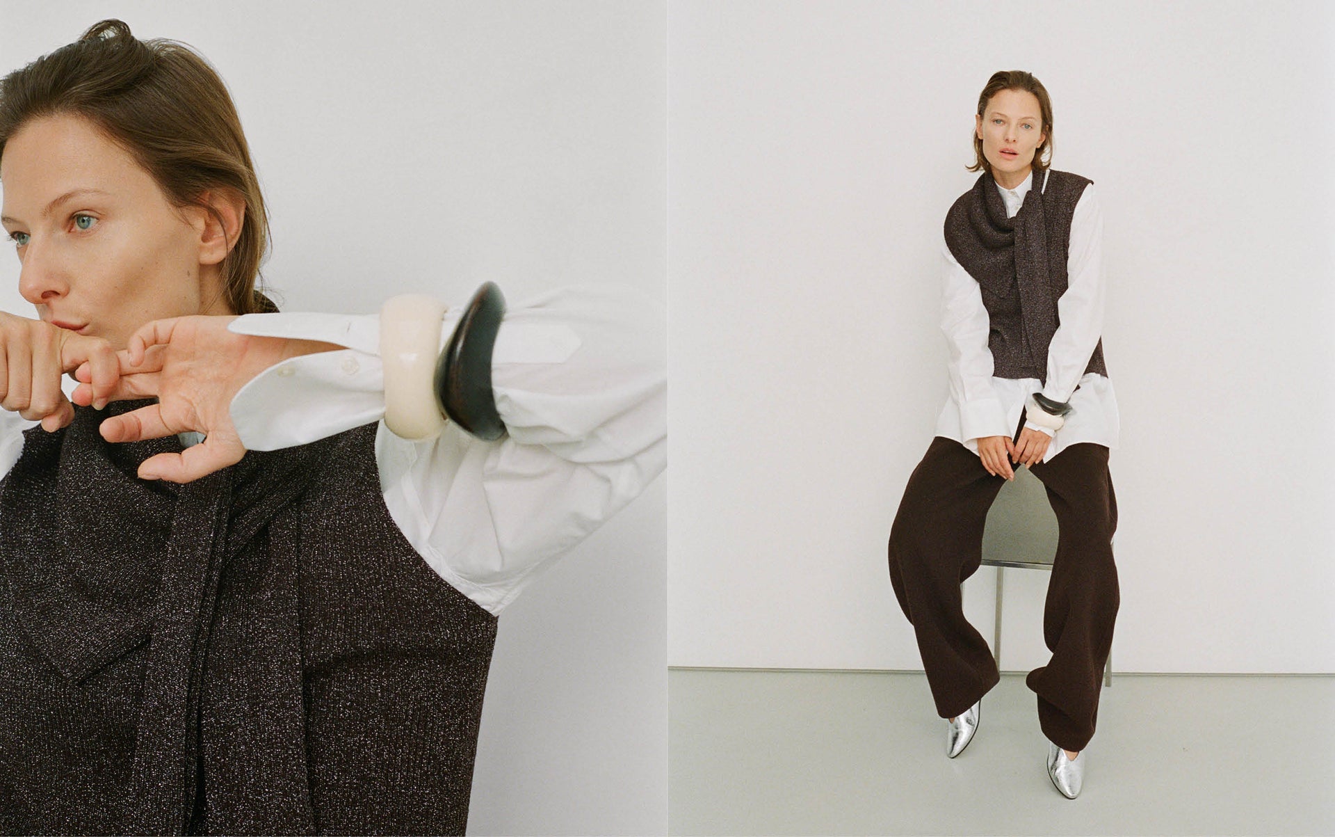 A timelessly elegant double-face brown sweater, an ecru wool and alpaca minidress or a midnight green sequinned skirt.