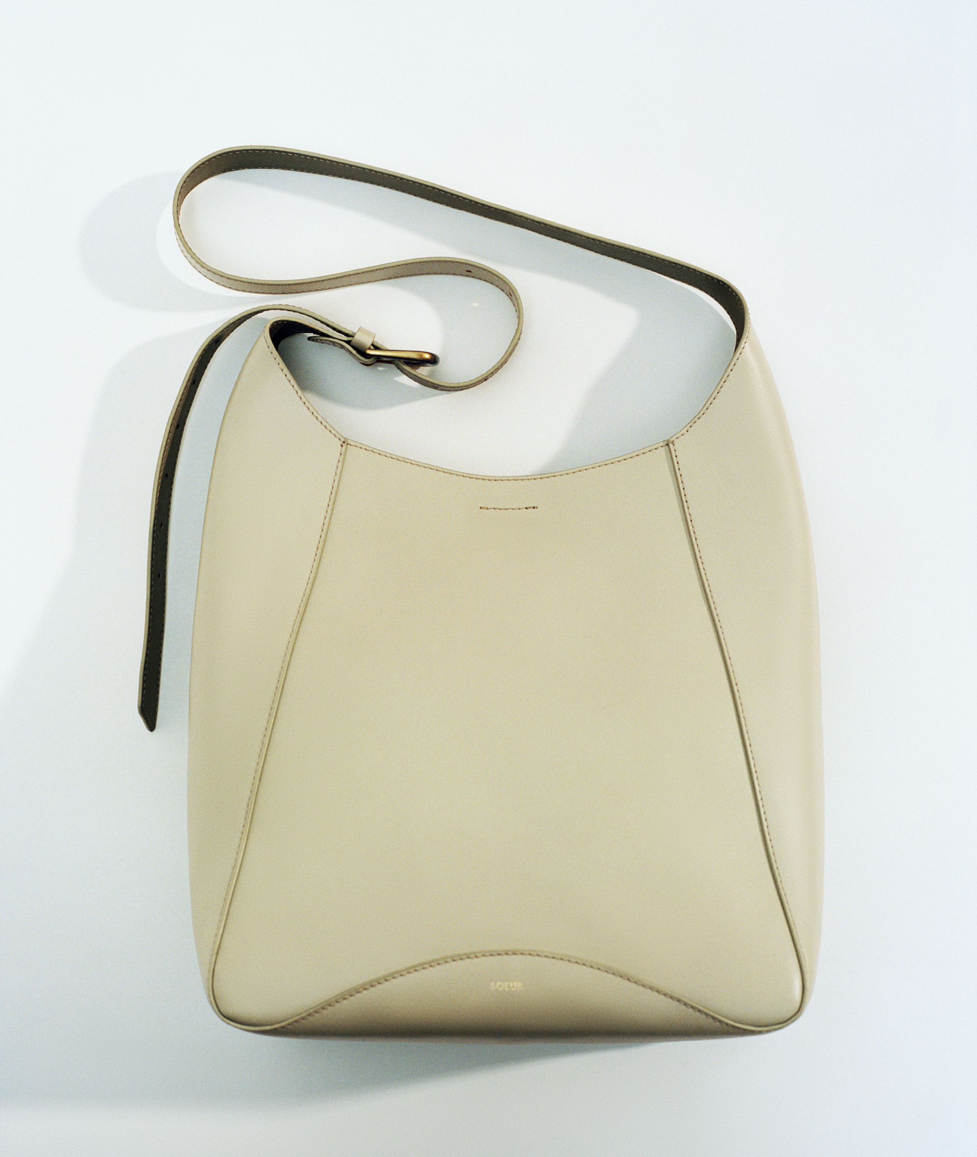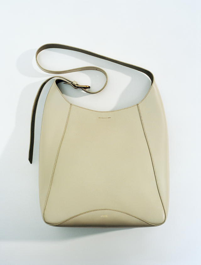 An elegant asymmetrical seam, a soft pastel oscillating between sage and putty: our new bucket bag for a new season.