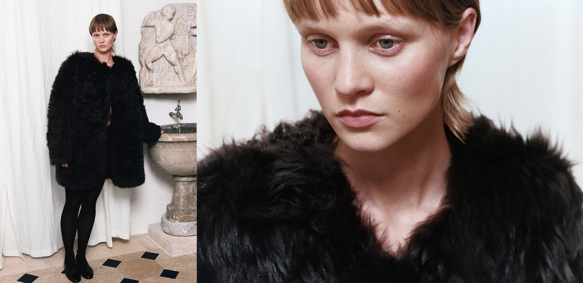 An oversized suit taken from the male wardrobe appears alongside a pared-down strapless wool dress. Shearling warms the body, while leathers glow in deep olive green or glossy black. Fine-gauge knits glide softly over the skin. Ivory Théa pumps, the Suzanna patent leather bag and a pleated silk scarf complete this sophisticated and understated look.