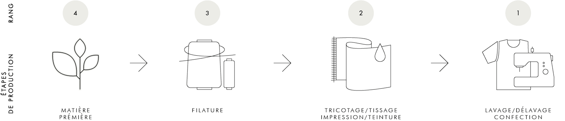 The garment manufacturing chain is made up of 4 main stages: production and extraction of raw materials, transformation of raw materials (spinning), weaving, knitting, dyeing or printing and finally garment manufacture. As a brand, we are in direct contact with clothing suppliers (tier 1) and sometimes with material suppliers (tier 2).